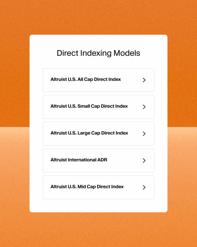 - Choose from 5 institutional-grade Direct Indexing models: U.S. All-Cap, U.S. Large-Cap, U.S. Mid-Cap, U.S. Small-Cap, and International ADR.