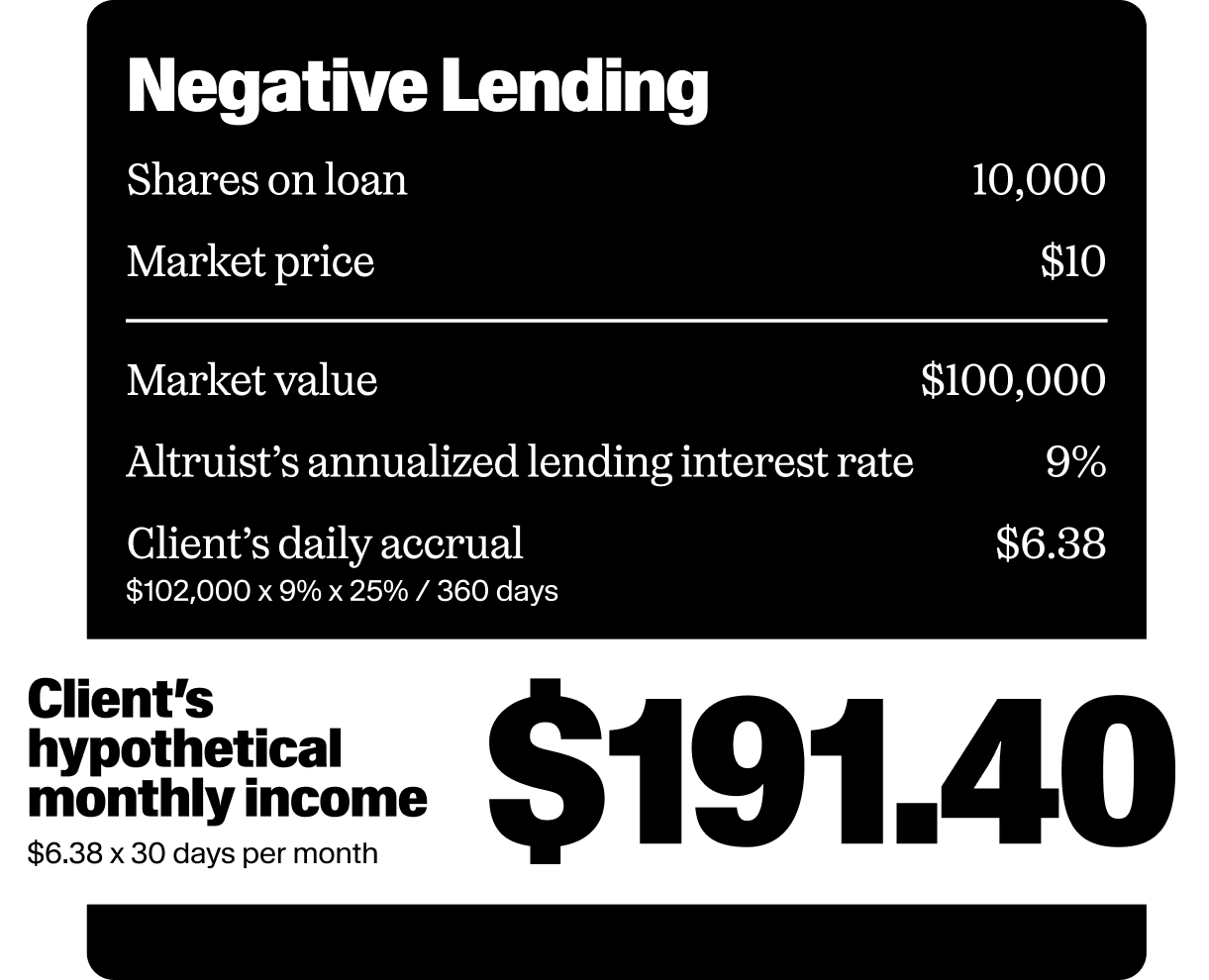 Negative Lending: If there is demand for the securities, a borrower may be willing to pay a rebate to borrow the shares. The client receives 25% of the net rebate earned by Altruist. If the net rebate is 9%, the client receives $6.38 per day.