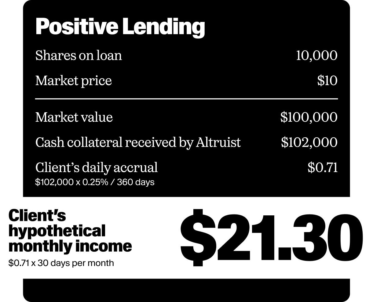 Positive Lending: Other times, a borrower is not willing to pay a rebate (for example, because it’s easier to borrow the shares), but is willing to accept a rebate. Even if Altruist pays the borrower a rebate, it can still earn revenue from the interest earned on the cash collateral received from the borrower to secure the shares on loan. In that case, the client receives .25% of the value of the cash collateral. The client does not pay any portion of the rebate Altruist pays to the borrower.