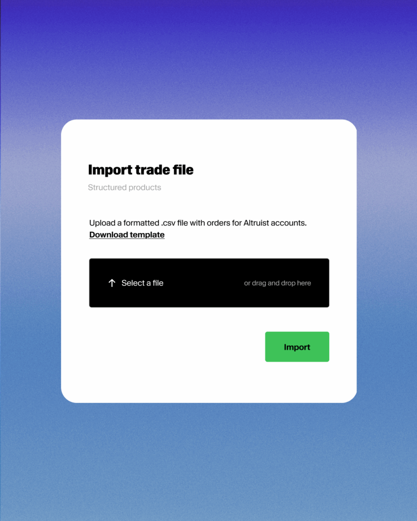 Simple CSV upload: Submit account-specific structured note trades via one simple CSV. No more back-and-forth — just clean data, and fast execution.