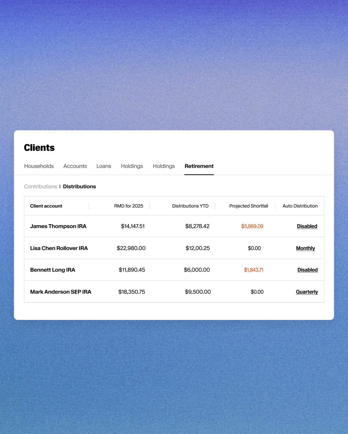 Easily track year-to-date contributions, distributions, and projected RMD shortfalls across all your clients from the Retirement Dashboard.